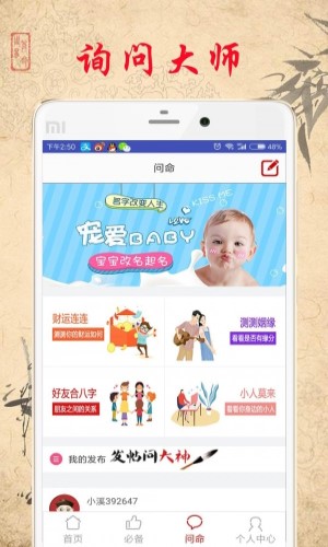 2、询问大师:在线大师通过性格分析,心理测试,塔罗,六合生辰八字,星座算命,命理占卜,生肖配对,姓名日历,周易风水,求签六爻卦,相面手相,八卦易经综合预测。