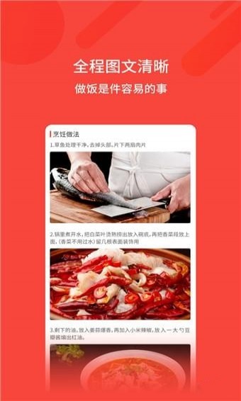 超美观的界面设计,图文并茂让你看清楚每一道菜的做菜方法,轻轻一划即可查看厨房美食烹饪方法。做菜教学简单,无基础也可轻松学会家常菜做饭,为家人烹饪美味的饭菜,提升幸福感。