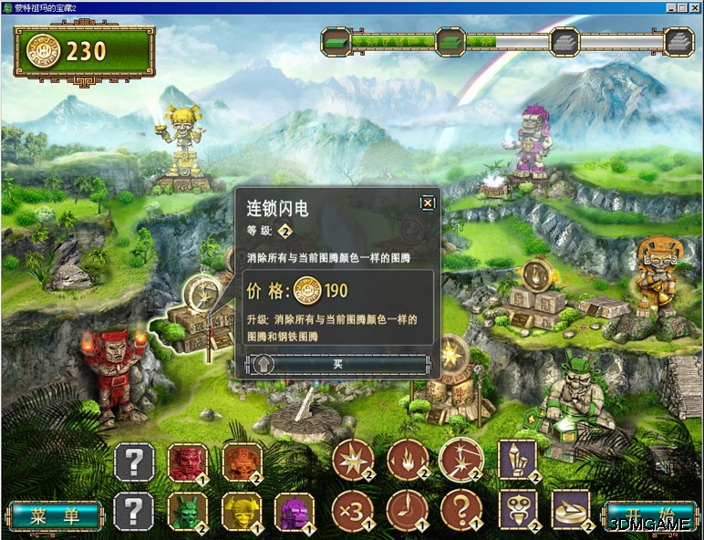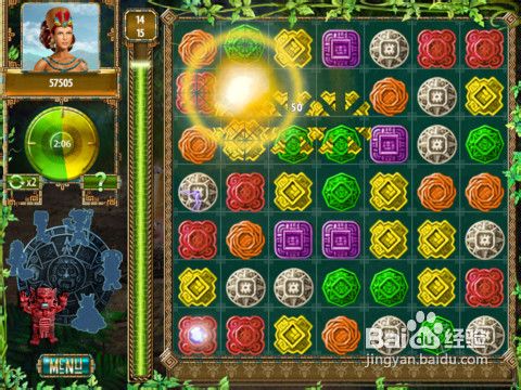 4.普通奖励物品和能量奖励物品是可遇不可求的。但是在消除过程中,除非是为了激活图腾的需要,能够同时消除4个或者5个同色牌的,尽量这样做,得到的奖励物品越多,屏幕的震动机会越大。消除顺序大致为从上倒下,先竖后横。因为往往动了下面的,会影响上面的位置。不过玩熟了也可随便。2星级闪电链也可以粉碎铁块,如果保护图腾难以激活,可以尝试同时对5个同色牌使用成队法。游戏过程中,指示键上面有两个小按钮,表示重新洗牌。觉得这一把太难打了,可以重新洗一下,不过每个小关里面只有两次重新洗牌的机会。有些时候,可以激活时间图腾,然后洗牌,在下一扑里连续激活,这样可以增加时间图腾激活机会。