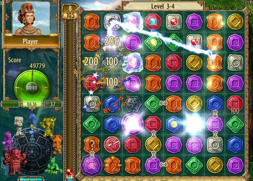 在规定的时间内,消除镶有宝石的图腾,达到指定的宝石数量便可过关。消除规则采用了常见的玩法,在出现新的道具时,游戏中会有提示和说明来指导玩家使用。全新的故事情节和充满冒险的游戏主题,为我们呈现出又一部精彩的消除游戏。玩家可以在摘星的奖励关卡中获取更多的星星,为多达15种道具进行升级,并可运用消除技巧收集七种力量图腾,和九个不同的奖杯。