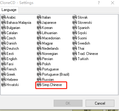 5.首次运行CloneCD,在Language语言栏内选择SIMP.Chinese,界面显示为中文。