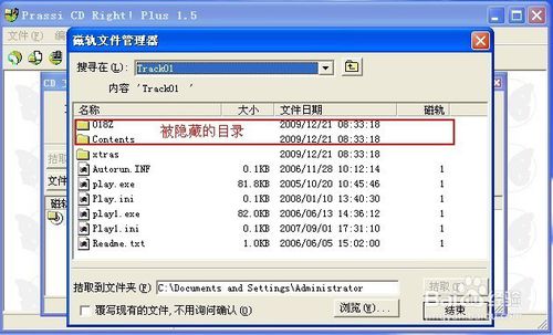 3.找来Prassi CD Right! Plus 软件查看磁轨,发现了被隐藏的内容,有两个文件夹,进行提取和拷贝,死活出错拷贝不下来。再试了试前面几次拷贝光盘的软件和方法都无法识别和拷贝下来。