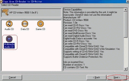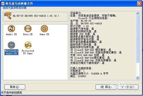 6.选择将光盘写成映像文件,选择MultimediaAudio CD这项,将支持视频内容。