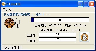 8.开始进入克隆光盘,读到5%处进度就开始十分缓慢了。估计是读取到了防盗圈的位置了。