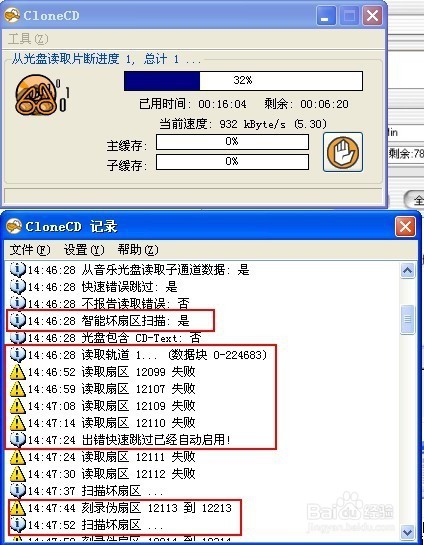 9.估计大约有十分钟的样子, 进度有开始继续进行得比较快了。菜单中点击查看记录,读取到了N多的坏扇区和坏道。都被CloneCD 智能跳过了。