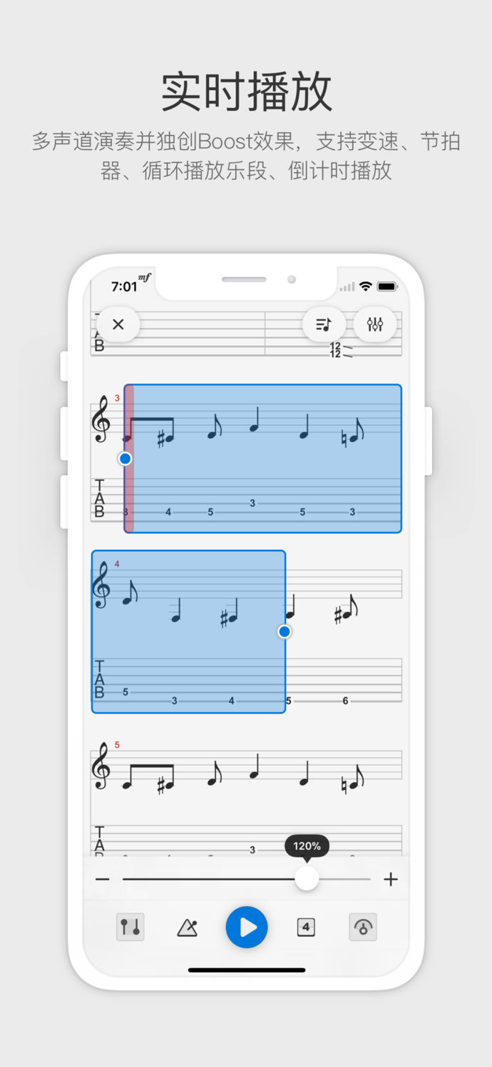 贝壳吉他谱app支持乐谱实时播放。除常见的静音效果、独奏效果、音量调整外,贝壳吉他谱app独创Boost增益效果。