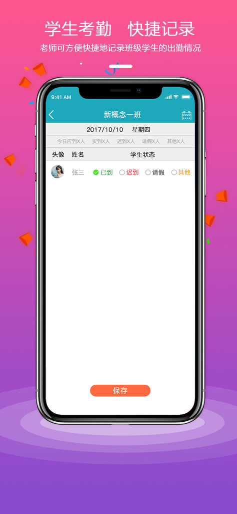 老师可通过金牌君app方便快捷地记录班级学生的出勤情况。