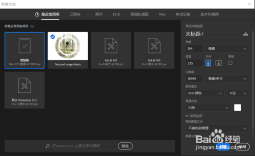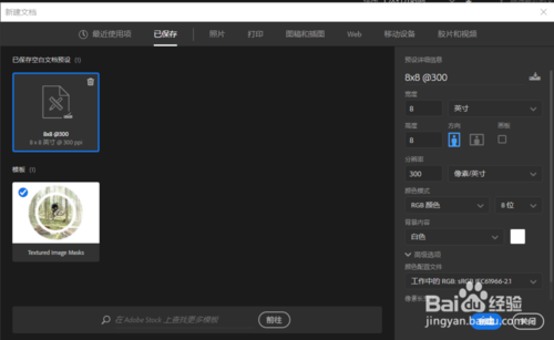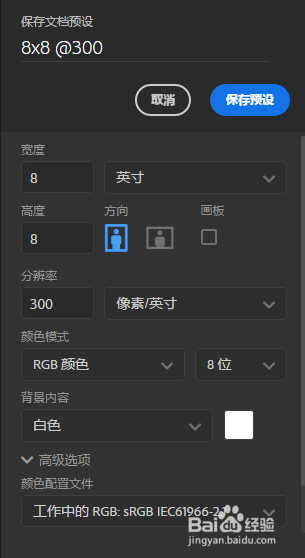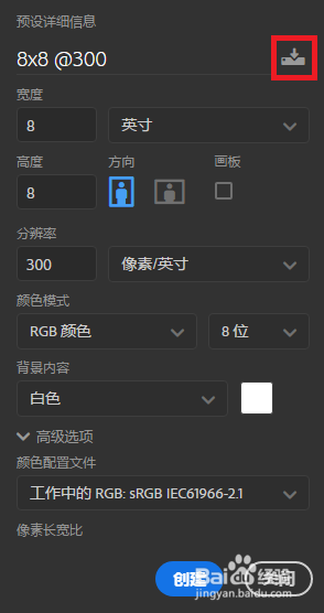 第四步,我们输入预设格式之后(如 高和宽是8英寸,分辨率为300的格式),我们命名之后,点击名称旁边图标。