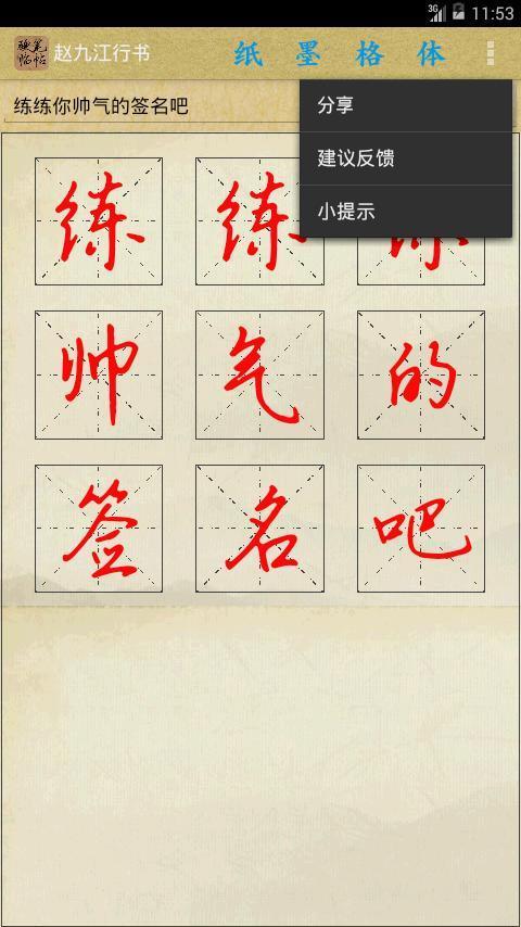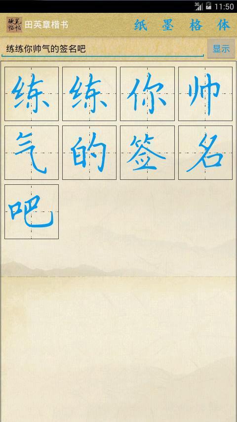 1.输入自己需要练习的汉字、喜欢的字帖,文字会自动在田字格里显示出来2.自由切换内置的纸张背景、字体颜色