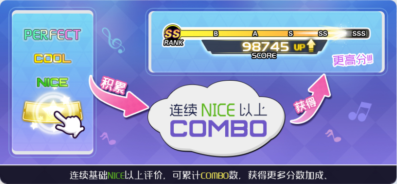 3) 连续击出nice及以上评价,可以累积combo(连击数),combo越多分数加成越高