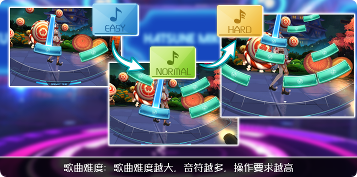 1) 每首歌都可以选择不同的【难度】,分为4种难度:EASY、NORMAL、HARD、EXTREME,难度越大,音符越多,操作要求也越高