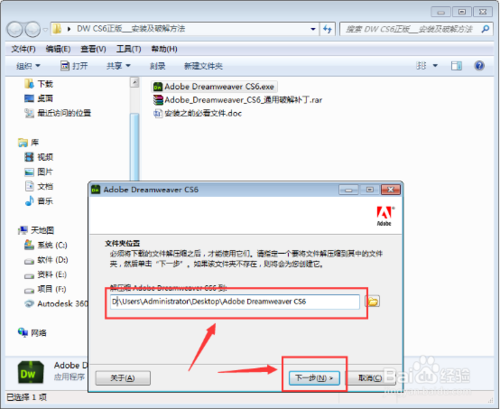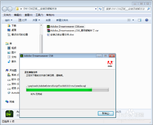 正式安装开始,首先双击Adobe Dreamweaver CS6.exe,它是先进行解压,可以给它选择一个解压路径,默认是解压到桌面上。单击下一步,解压开始。 如下图所示。