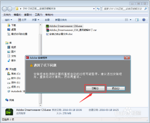 解压完成后,Dreamweaver CS6会自动进入安装界面,这时会弹出一个对话框,直接点击忽略进行安装,如下图所示。