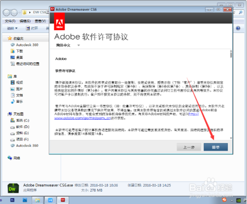 进入安装Dreamweaver CS6软件许可协议界面,点击接受进行,下一步安装,如下图所示。