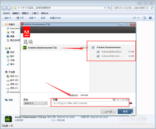 这里我默认选择了所有拓展功能,并把Dreamweaver CS6安装路径指定到了D盘,然后点击安装,如下图所示。