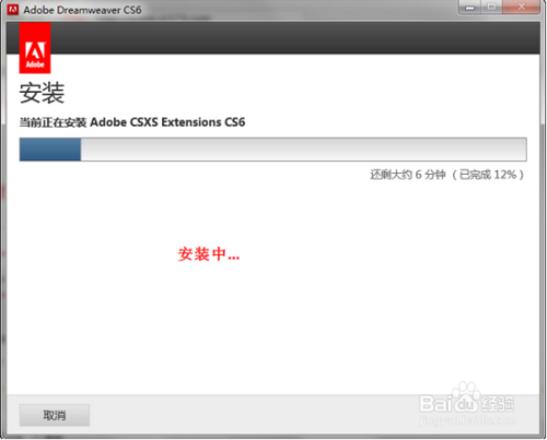 点击后,Dreamweaver CS6开始真正安装了,整个安装过程大约6分钟吧,稍等一会,如下图所示。