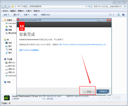 Dreamweaver CS6安装好后进入安装完成界面,这里先我们点击关闭,然后来激活Dreamweaver CS6。(这个时候可以把网络重新连接上了)如下图所示。