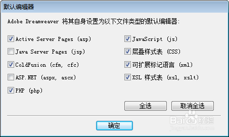 Dreamweaver cs6激活成功后,就可以打开Dreamweaver cs6软件了,第一次打开Dreamweaver cs6软件,会提示关联文件,这个根据自己需求吧,我全选了,因为有时候会用一些其他的语言来编辑网站,直接点击确定,如下图所示。