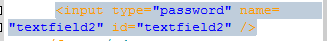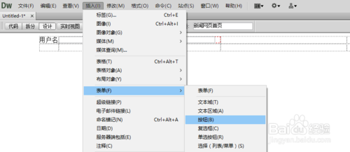 在表格第一行第一列输入“用户名”,在第一行第二个表格插入“文件域”。然后是密码,同样的插入“文件域”。切换到“拆分”界面,选中密码对应的“文件域”,将“type”改为“password”