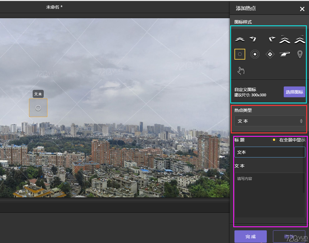 在紫色框处输入热点的标题,并框选是否显示热点的名称(在全景中显示选项)