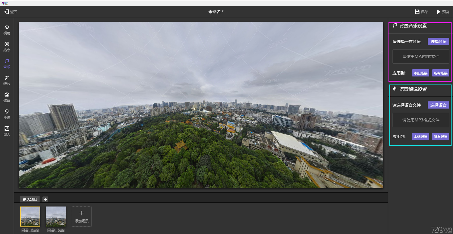 点击本组场景或全部场景选择将音乐或解说添加到本组作品或全部作品