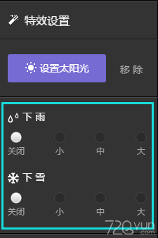 点击特效,在蓝色框处选择小/中/大直接开启雨或雪特效与特效强弱