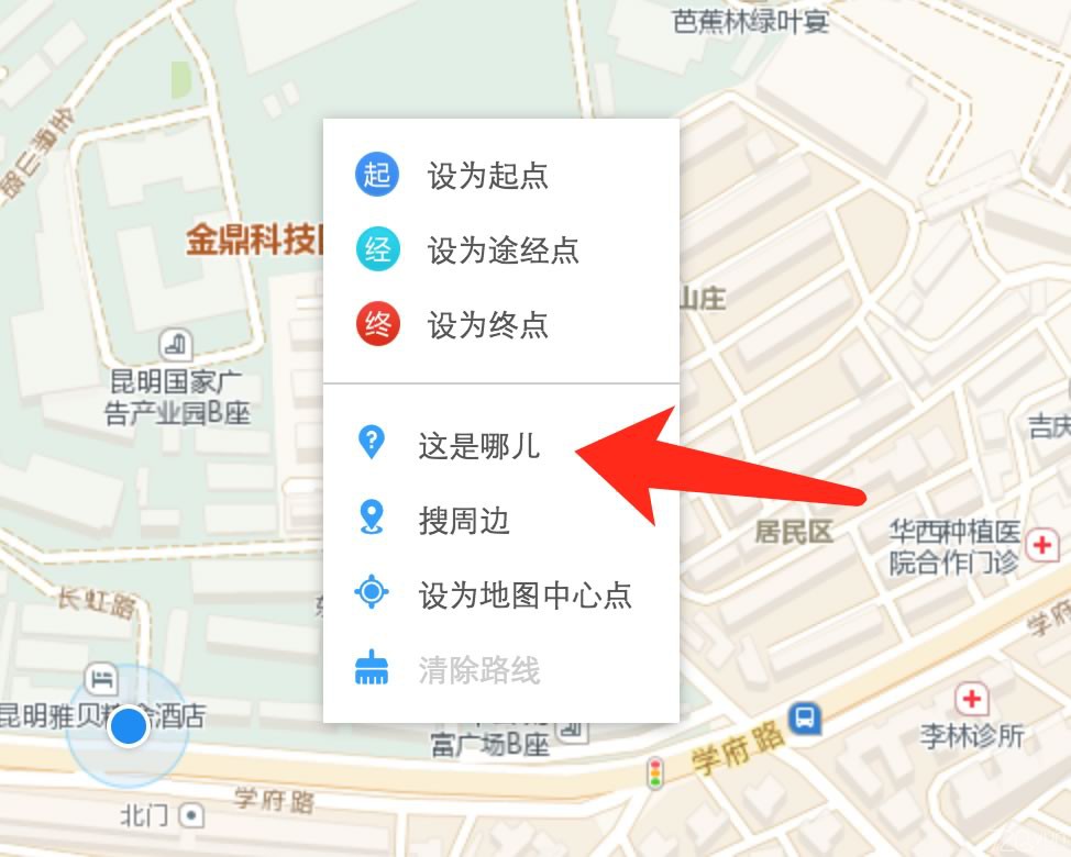 3.点击鼠标右键呼出菜单,选择“这是哪儿”,设置好以后,会在地图中出现一个红色图标与地点说明