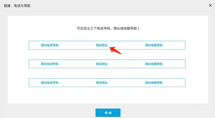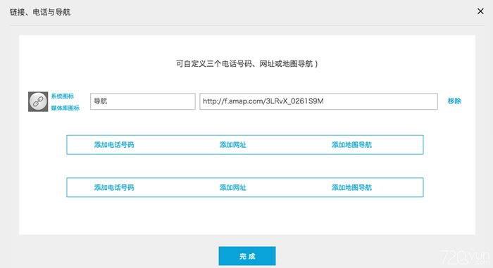 5.转到720yun中,打开作品编辑页中的“电话、链接与导航”功能,点击“电话”按钮,在输入框中填入刚才复制的那串地址,点击“完成”按钮即可完成相关设置。(网站与桌面客户端通用)。