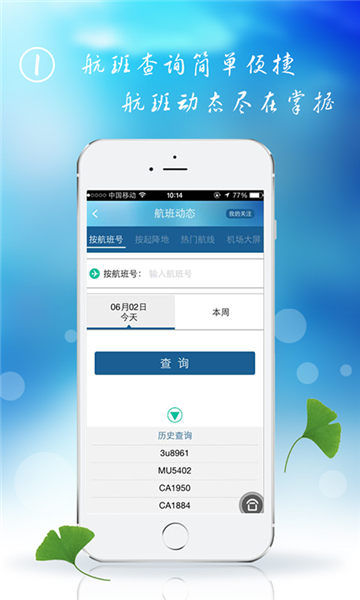 我的关注:根据已关注航班的状况按照机场乘机流程的方式展示航班详情,同步查询机场天气、机场交通、安检须知以及机场地图等信息,同时提供航班早/晚高峰提醒和延误/取消航班指南。旅客可定制选择已关注航班动态消息是否自动提醒;