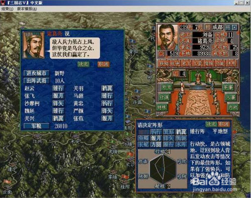 打仗前记得训练度最好100,战场总结一句话:武将技能越BT越好,武力高武将去单挑,智力高武将用计谋,阵形结合地形,防火用计看天气。