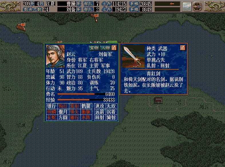 伏兵:费体力30,向部队4格范围内的在森林中的敌方一支部队施行,成功加150点经验,不成功加50点经验,成功的话敌部队陷入混乱状态,减兵2000-2500左右,伤兵一半左右,士气下降,但士气不是下降固定数值,一般10点以内,但敌方武将已经在混乱状态则不减士气。