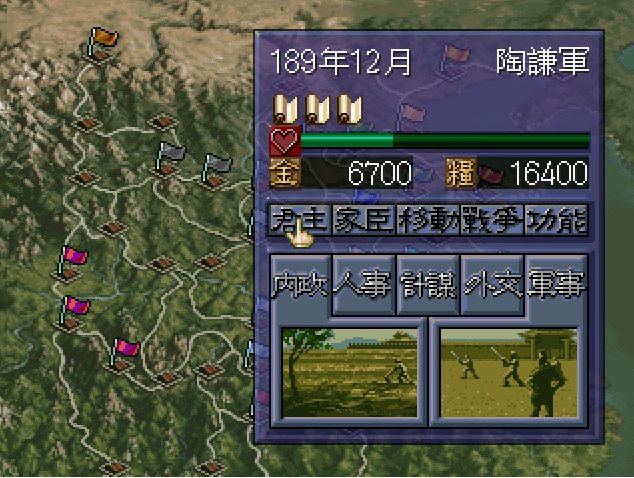 196年10月至12月 实施屯田制:於剧本一至三中,曹操支配有许昌城且有任命任何参谋;有韩浩为部属时,若资金超过三千便会发生此事件。