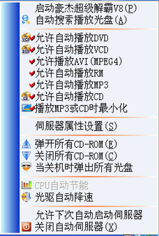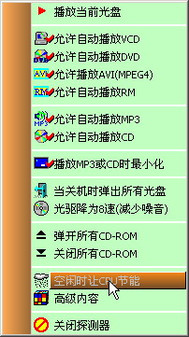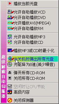 不知道大家有没有这样的经历,有时候在光驱中放了一张CD或MP3,但是关机后却发现记了把它取出来,这时候只有再次打开计算机电源,将光盘弹出.其实,在超级解霸的系统伺服器还有一个选项"关机时弹出所有光盘"(如图5),当我们选中它时,每次关机时系统一旦发现光驱中有光盘,它就会自动地将所有的CD-ROM的光驱盒盖弹出,供您将光盘取出,免去了一时忘记拿盘,再次打开机器电源之苦.这个功能可是任何其它一款光驱工具所不具有的哟,是不是方便多了.