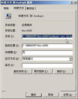 有时候当放入一张CD、MP3或VCD光盘后,需要点击启动"豪杰豪杰超级解霸"\"超级音频解霸"来播放CD或MP3光盘,点击启动"豪杰豪杰超级解霸"\"豪杰超级解霸"来播放VCD光盘,是不是觉得有些麻烦?请试着在桌面上为超级解霸的自动伺服器建立一个快捷方式,并加上一个参数 /play(如"C:\HEROSOFT\Hero3000\SysExplr.exe /play",如图6),再试着将光盘放入驱动器中,双击该快捷方式,怎么样,系统会自动地识别出是什么格式的光盘,并会自动播放.