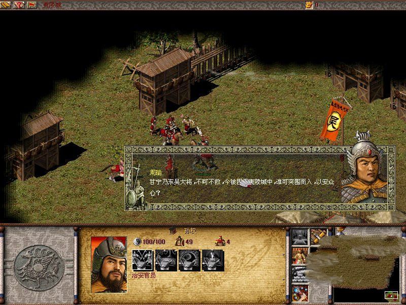 第一关比较简单,周泰虽然被周瑜骗去独闯敌围,但是一路之上倒是有不少士兵自告奋勇地相助。周泰只要进城就行,不需要与敌人正面交锋。一路敌人的阻拦并不激烈,只是在刚刚进入城市地图的时候要稍微小心一下,敌人会在入口处堵截,不要恋战,绕过去直奔城门。冲进城门后,看见东吴第一大将甘宁,两人密谋一番,将士兵拉进城楼,投石车开上城墙,各就各位,准备敌人的疯狂进攻。同时,周瑜的部队也终于在地图东南角出现,让他们也向夷陵开进,会在城下遭遇曹仁的援兵,遭遇战的胜负不要紧,反正敌人很难冲破城门这一关。城门口的战斗结束后,敌人剩余的士兵已经非常少,出去搜寻一下,很快就可以过关。