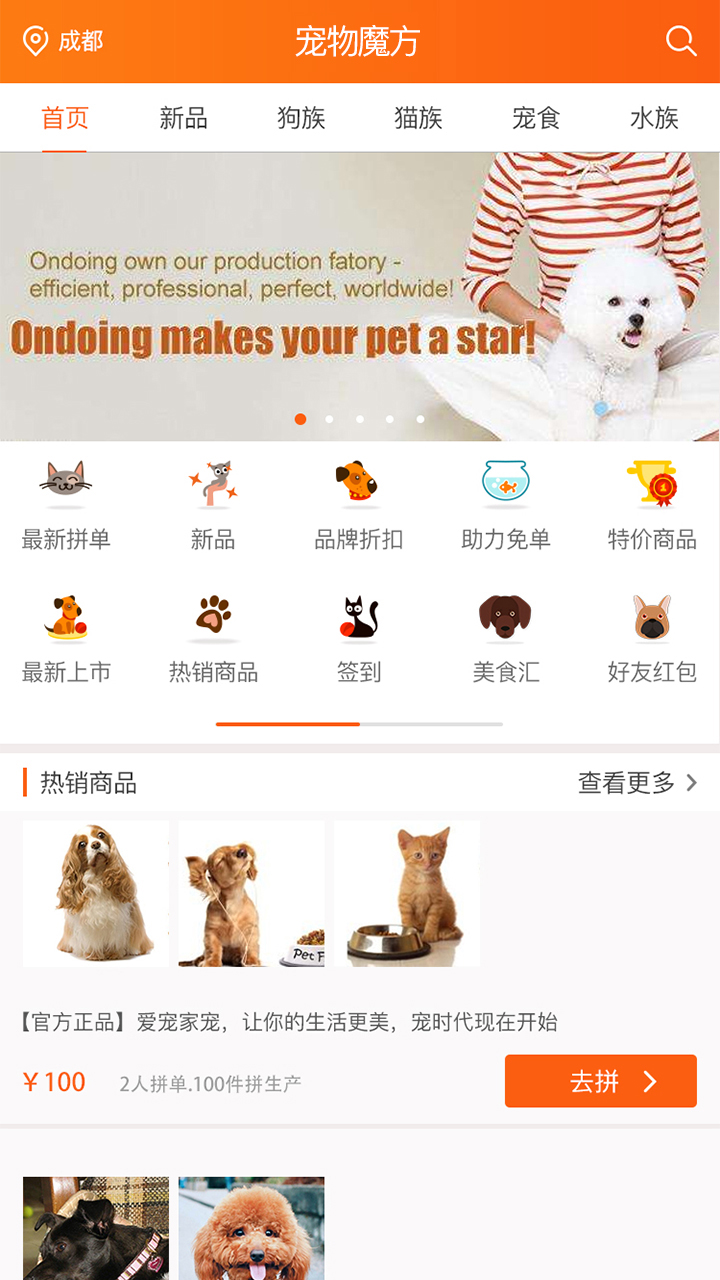 宠物用品的商城APP,给宠物用品生产厂家和宠物店提供一个优质、便捷的交易方式,商家可以在线发布自己的商品,会员可以在线拼单,拼生产下单,在线支付,方便,快捷。