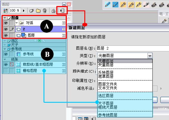 红色的a部分是和ps概念一致的图层,一张图分多少层,删减添加,都可以随意操作。图层格式主要有光栅和矢量,两者区别在有些笔刷只能在特定图层使用(各位自己尝试各种笔刷就知道了)