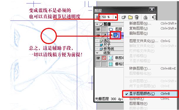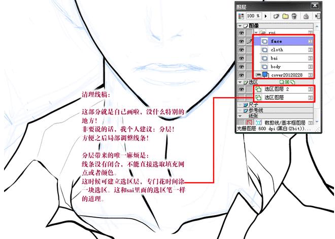 简单的说:红色的a部分是最终显示在导出后画稿上的;蓝色的b部分,侧不会出现在导出后的画稿上。 图中建立选区层、框线层,这些即使不删除,导出也不会留在画面中