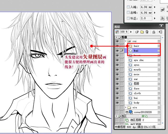 矢量层:图像数据基于矢量形式,可以任意放大缩小不会出现锯齿、模糊。(印刷出来线条边缘清晰锐利。)这个图层的线条都可以单独的被改变形状,或者改变粗细。举个例字,如果我画的某个人物的脸部有些不够饱满,我可以使用矢量线调整工具单独把某个线条拉伸调整。这似乎对画较长的线条很有帮助。(我一般都在这个层绘画。)