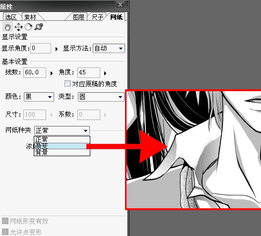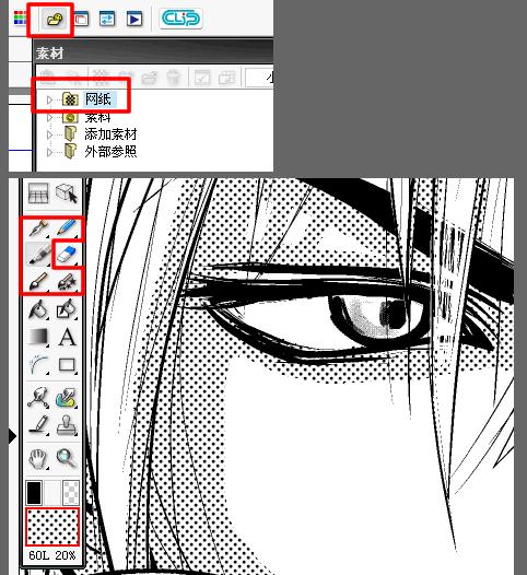 注: 通过【素材】贴的网点纸会自动建立一层,如果要在已经有的网点层上增加网点范围,直接选择笔刷就可以画了,不用再点网点纸的选框,如果点选网点框再用笔画,又会自动新建一层网点。这句话可能没接触过的人看了会不明白,自己操作一下就懂了。 叠加的网点可能会影响后面导出效果,造成撞网之类的。
