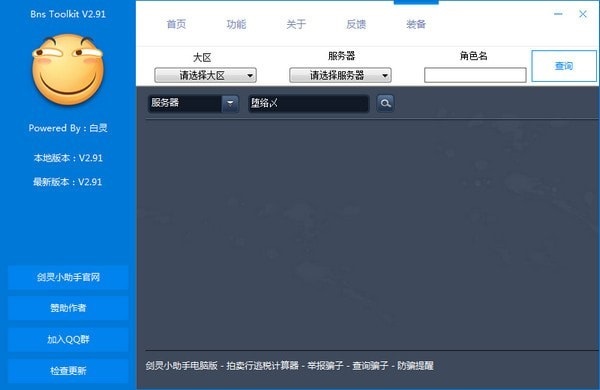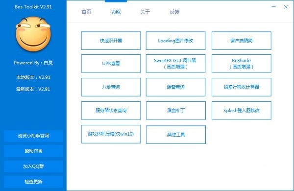剑灵工具箱是一个多功能剑灵辅助工具,拥有包括快速双开器、Loading图片修改、客户端精简、UPK查看、SweetFX GUI调节器、ReShade、八卦查询、装备查询、拍卖行税收计算器、服务器状态查询、溅血补丁、Splash登入图修改、游戏体积压缩等在内的十三种不影响游戏平衡的游戏辅助功能,安全无毒,并且无封号风险,请放心使用。