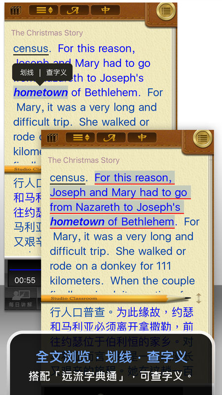 4.可查看中文翻译,并提供英/中同步阅读,以训练听、读、译能力。