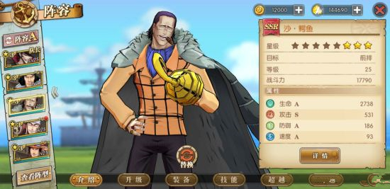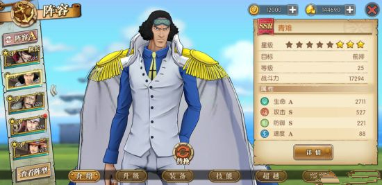 索隆也是很多玩家喜欢的SR角色,也是非常容易抽到,索隆的伤害能力比较全面,有单体技能,有直线技能,并且有较强的斩杀能力,但是自身的防御能力和血量比较中庸,是一位补刀类型的角色,但是大家非常喜欢这位角色的话也可以练,毕竟好抽到,超越的时候不用浪费古铜战魂。