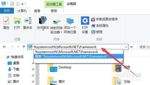 如果感觉上次的操作比较麻烦,我们也可以直接打开此电脑,然后在地址栏中输入%systemroot%\Microsoft.Net\Framework地址