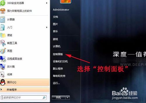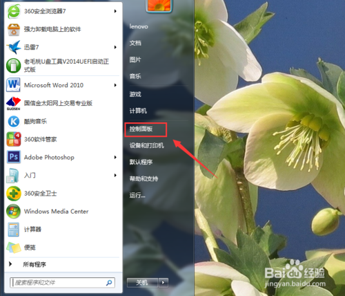 打开桌面左下方的“开始”菜单,在右方窗口中选择“控制面板”