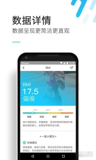 「精准全面的数据详情」智能体脂秤为你提供体重、体脂、BMI、水分、蛋白质等12项全身数据,及脂肪率、肌肉量等10项局部数据的测量,统计、分析你的身体状态,并提供合理化的饮食、锻炼建议。