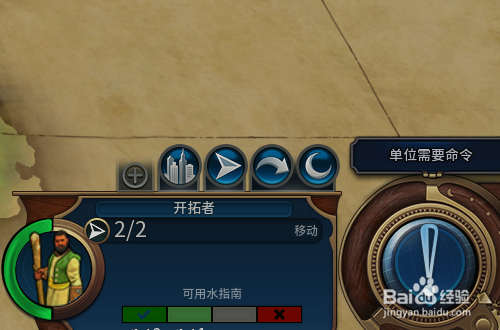 5、研究开始后,又出现了勇士同时右边出现了叹号,并且写着单位需要指令。这表明要指挥勇士,指挥勇士有移至,驻扎,跳过回合三种指示。点击移至吧。移至能探索周围环境。