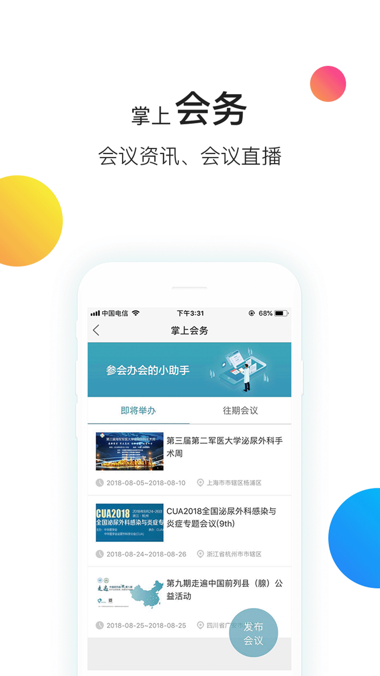 掌上会务——主办方可以发布医学会议,管理会议议程,邀请讲者、主持,分析参会数据;参会者可以报名参会,在线观看直播,关注议题,现场互动,等。