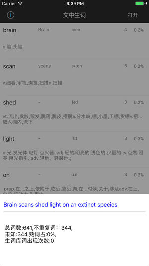 2、分析英文难度:有多少不认识的单词,占比多少,词汇生僻度,单词总量等。