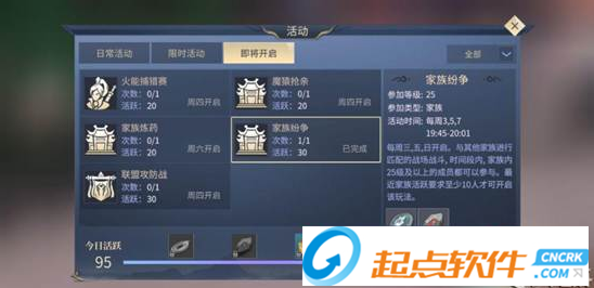 “家族纷争”玩法是在每周的3、5、7晚上的19:45~20:01开启,活动时间内有1分钟的准备时间和15分钟的进攻时间。活动时间段内,家族中25级及以上的成员都可以参与,而正常来说,斗者第一天创建角色只要完成当天所有任务即可轻松达到26-27级,所以这个等级门槛可以算是比较低的。